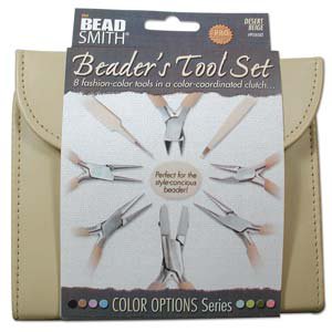 This 8 piece tool set is part of the popular and classic BeadSmith Color Options series. This contemporary and cool color coordinated 8 piece tool set and clutch features a complete set of jewelry making tools. In this case are: 2 sets of tweezers (split ring and knotting), chain nose pliers, bent nose pliers, round nose pliers, flat nose pliers, side cutters, and nylon flat nose pliers! Be the envy of your crafting group with this fashionable and stylish tool set! Each set of pliers matches the smooth beige color of the carrying clutch. The pliers have polished steel heads and double leaf spr