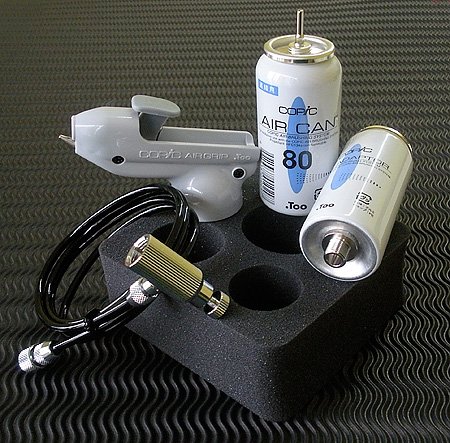 Your favorite COPIC markers can easily become an airbrush. Copic markers and Sketch markers both work with the Airbrush System. Simply insert the standard broad or medium broad end of a Copic marker or Sketch marker into the air grip. The air grip can be hooked up to an air compressor or used with a special air can. Changing colors is as easy as switching markers. The COPIC Airbrush System Set 1 comes with the COPIC Airgrip COPIC Air Can 80 COPIC Air Hose COPIC Air Adaptor 1/8 inch COPIC Air Can Holder and an instruction manual.