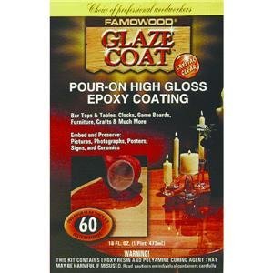 FAMOWOOD Glaze Coat is a pour-on epoxy coating. This ultra-clear, high-gloss finishing epoxy is ideal for home improvement and craft projects. Just one coat equals 60 coats of varnish. Glaze Coat is great for coating tables, bar tops, preserving pictures and photographs or imbedding items such as coins or rocks.