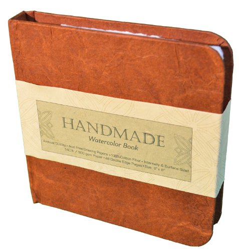 Hand-book journal co. Handmade watercolor book 8-inch-by-8-inch, square is constructed of full sized, handmade sheets with deckled edges. Bound in a beautiful hardcover book which has been finished in a rust colored handmade paper. The watercolor sheets are folded in half to create 48 pages of these unique and one of a kind range of watercolor books. The paper is a heavy weight 300gsm, internally and externally sized creating an extremely durable and workable sheet. This series is available in 7 sizes.