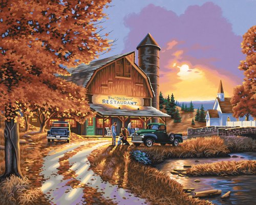 A restored barn has become a wonderful place for families to enjoy a peaceful dinner. The detail and illumination in this nostalgic paint-by-number scene is absolutely incredible. Kit contains High-quality acrylic paints, pre-printed textured art board, and #1 round paintbrush. Finished Size: 20-inches-by-16-inches