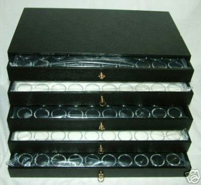 5 Drawer Jewelry Organizer Display Case 250 Gem Jars 5 Drawer Jewelry Organizer This is a new black 5 drawer jewelry storage organizer case Protect samples in storage and transport with this durable case Has 5 full size drawers that fit any full size insert or pad It measures approximately 15 1/8" x 8 3/8" x 7 5/8" (38.4 x 21.3 x 19.2 cm) 5 Gem Jar Tray Inserts This is a new set of 5 gemstone inserts. Each contains 50 removable clear plastic round jars. These will hold all of your loose stones, beads and coins. Each gem jar comes with an insert pad inside and lid. The inside diameter of each g